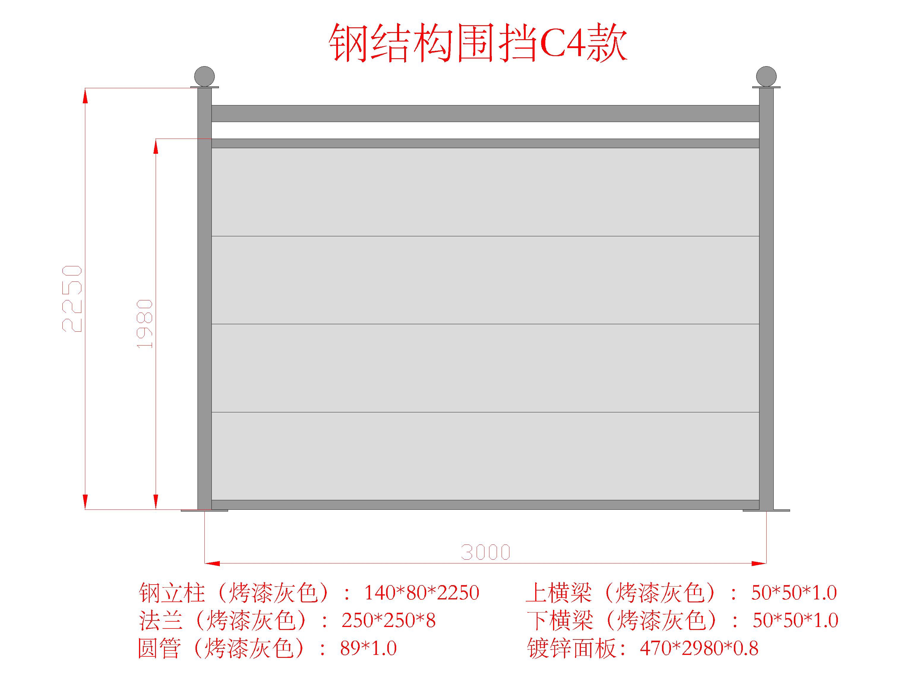 鋼結(jié)構(gòu)圍擋C4款是在深圳市交委方案標(biāo)準(zhǔn)設(shè)計(jì)的基礎(chǔ)上,稍做優(yōu)化,上下橫梁為50*50方通,圓梁改為76鋼管,面板為鍍鋅扣板2980*470,灰色烤漆立柱高度為2.25米,加上預(yù)制基礎(chǔ)高度30cm,達(dá)到交委要求圍擋的整體高度、地面以上2.5m ,使人行道、廣場、泥巴地這些不易安裝的地方更好施工,并且為客戶節(jié)約了一定的材料費(fèi)用。